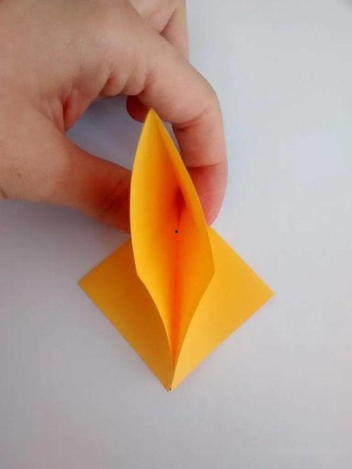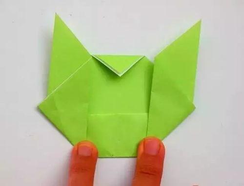 5. 折出小耳朵:将小三角形的两个角向上折,使得它们与顶点对齐。将两个小耳朵向内折,使得它们与底边对齐。